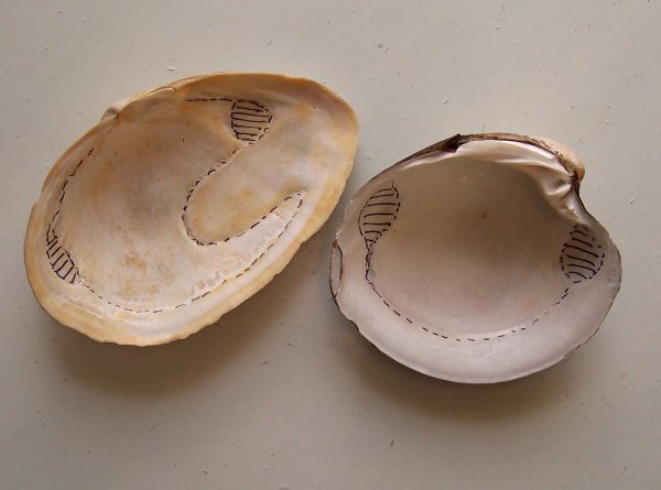 Mantellijn en spier-indruksels bij Strandgaper (l) en Noordkromp