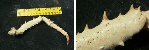 Mevrouw Goos uit Zwolle vond op 4 juni op het strand tussen paal 2 en 3 een poot van de Augustinuskrab. Deze krab is langs onze kust zeer zeldzaam en vondsten zijn wellicht afkomstig van viskotters die dicht bij de kust het dek hebben schoongemaakt. Niettemin blijft zelfs de vondst van een poot bijzonder; vooral vanwege de grootte en de stekels! Twee dagen later vond ik aan de vloedlijn bij paal 10 ook een poot, hoogstwaarschijnlijk van dezelfde krab!