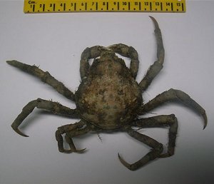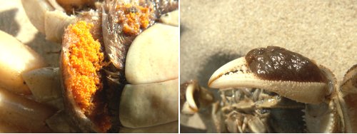 Ook op 31 januari vond ik in de vloedlijn bij paal 5 dit vrouwelijk exemplaar van de Chinese wolhandkrab. Zoals de naam al suggereert, is deze krab oorspronkelijk afkomstig uit China en Korea. In 1912 werd de soort voor het eerst in Europa gesignaleerd; in 1929 in Nederland. De Chinese wolhandkrab leeft in zoet water, maar trekt naar zee om te paren en eieren te leggen.