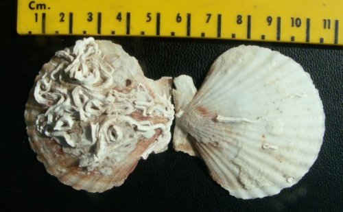 Op 25 oktober vond Emma Schutte op het strand bij paal 7 een prachtige klep van de bonte mantel. Stukken van deze soort zijn al zeldzaam, complete kleppen helemaal! De schelp die Emma vond is donkergrijs, maar er zijn nog enkele stukjes waarop de oorspronkelijke, bruinpaarse kleur zichtbaar is.