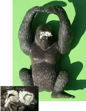 Marith Koek uit Sauwerd vond op 2 augustus een wel erg vreemd dier aan het strand bij paal 14: een aap! Het (plastic) dier had bovendien nog een soort 'bril' op, bestaand uit twee gekartelde zeepokken!