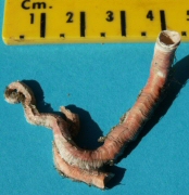 Deze fraai gekleurde kokerworm zat vastgehecht op een stuk viskist dat op 3 april jl. bij paal 12 was aangespoeld. Welke soort het is heb ik tot op heden niet kunnen vinden. De meeste kokerwormen zijn wit. Meestal betreft dat de driekantige kalkkokerworm.