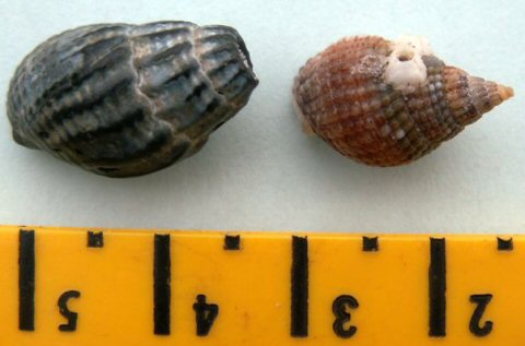 De heer Vroman uit Alphen aan de Rijn vond op 13 juli bij paal 8 een vers exenplaar van de gevlochten fuikhoren (rechts op de foto). Oude, fossiele schelpen met bredere verticale ribben spoelen wel vaker aan (links), maar verse schelpen zijn zeldzaam. Wel lijkt het er op dat de soort de laatste jaren steeds verder oprukt naar het noorden.