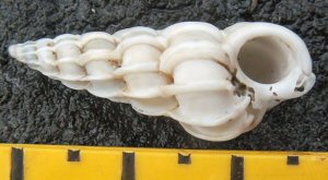 Mevrouw Wiersum uit Ermelo vond al weer enige tijd geleden (zomer 2009) hoog op het strand bij paal 16 een bijzonder fraaie schelp van de gekielde noordhoren. De schelp is weliswaar blauwgrijs, maar nauwelijks afgesleten.