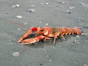 Netty Veenbaas uit Heiloo vond deze fraaie levende Noorse kreeft aan de eblijn tussen paal 8 en 9. Ze hebben het dier weer in zee gezet. Levende dieren spoelen maar zelden aan; wel zijn af en toe scharen van de Noorse kreeft te vinden. |