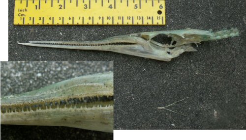 De familie De Vries uit Veenendaal vond op 6 juni een vreemde, lichtgroen gekleurde schedel met een soort lange 'snavel' aan de vloedlijn bij paal 10. Het is de schedel van de geep. Kenmerkend is de lange kaak (bovenkaak iets korter dan de onderkaak) en de groene kleur. Vroeger dacht men daarom dat deze vis giftig was.